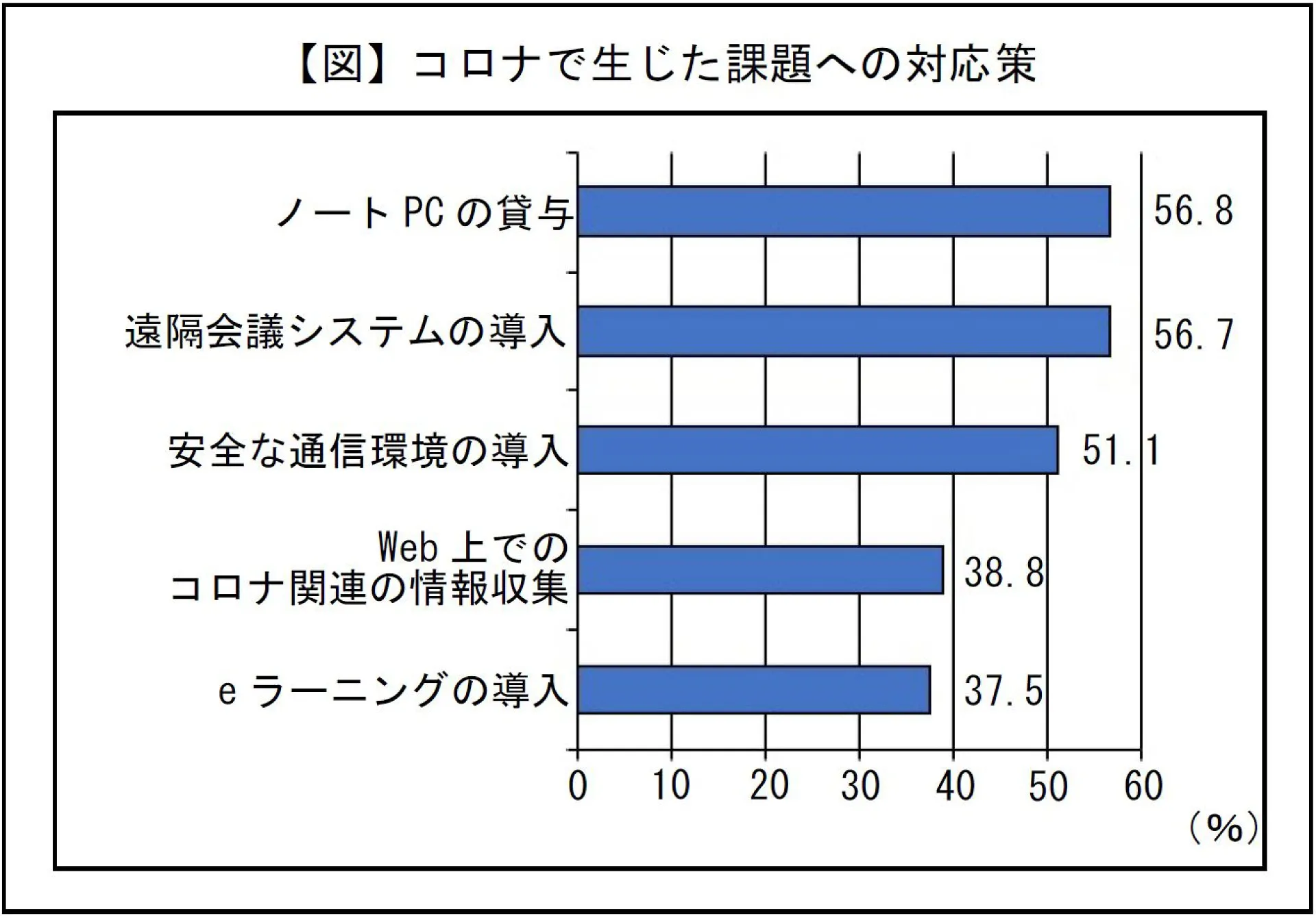 企業はコロナという変化に対応を迫られました。上図は日経BPが運営するCCL.が行なった「コロナショックと企業コミュニケーション」に関する調査から抜粋です。コロナで生じた課題への対応策を訊いています(トップ5を表示)。人と人との接触をなるべく避けて感染を防ぐという観点では、上記は望ましい措置といえるでしょう。しかしながら、今までと同じように働くための前提にすぎません。