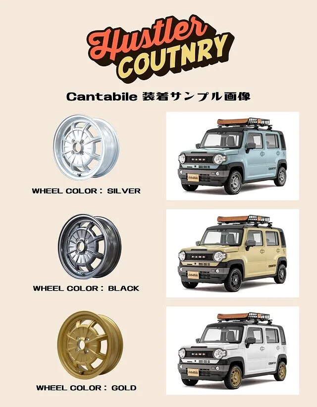 カントリーの迫力満載なフェイスチェンジキットに加え、ボディサイドを彩るグレー×迷彩柄のステンシルステッカー、立体感のあるクラシックデザインが特徴のホイール「Cantabile」全てがセットになったエクステリア完全コンプリートキット。