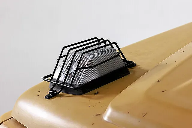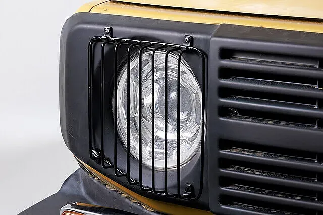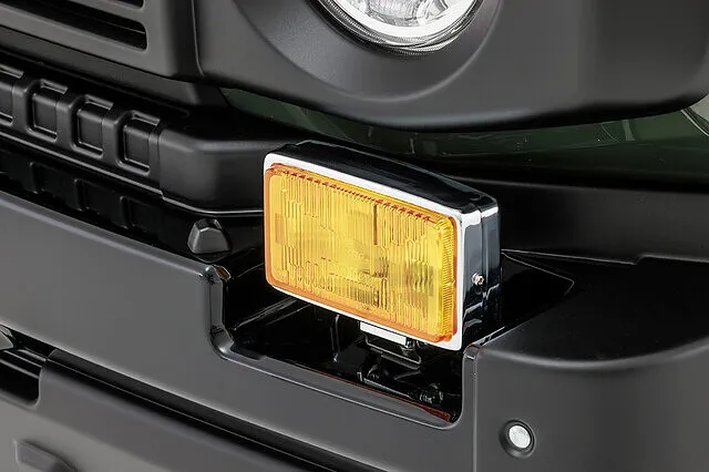 スチールバンパーのようなシンプルなデザインの中に、左右に配された別体の角型イエローフォグとアシンメトリーにセットされたナンバープレートが印象的。