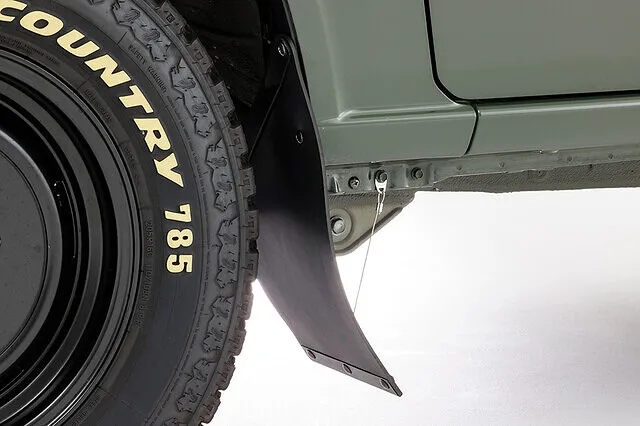 主流な材質を使わず、あえてクラシックな質感にこだわったゴム製マッドフラップ。