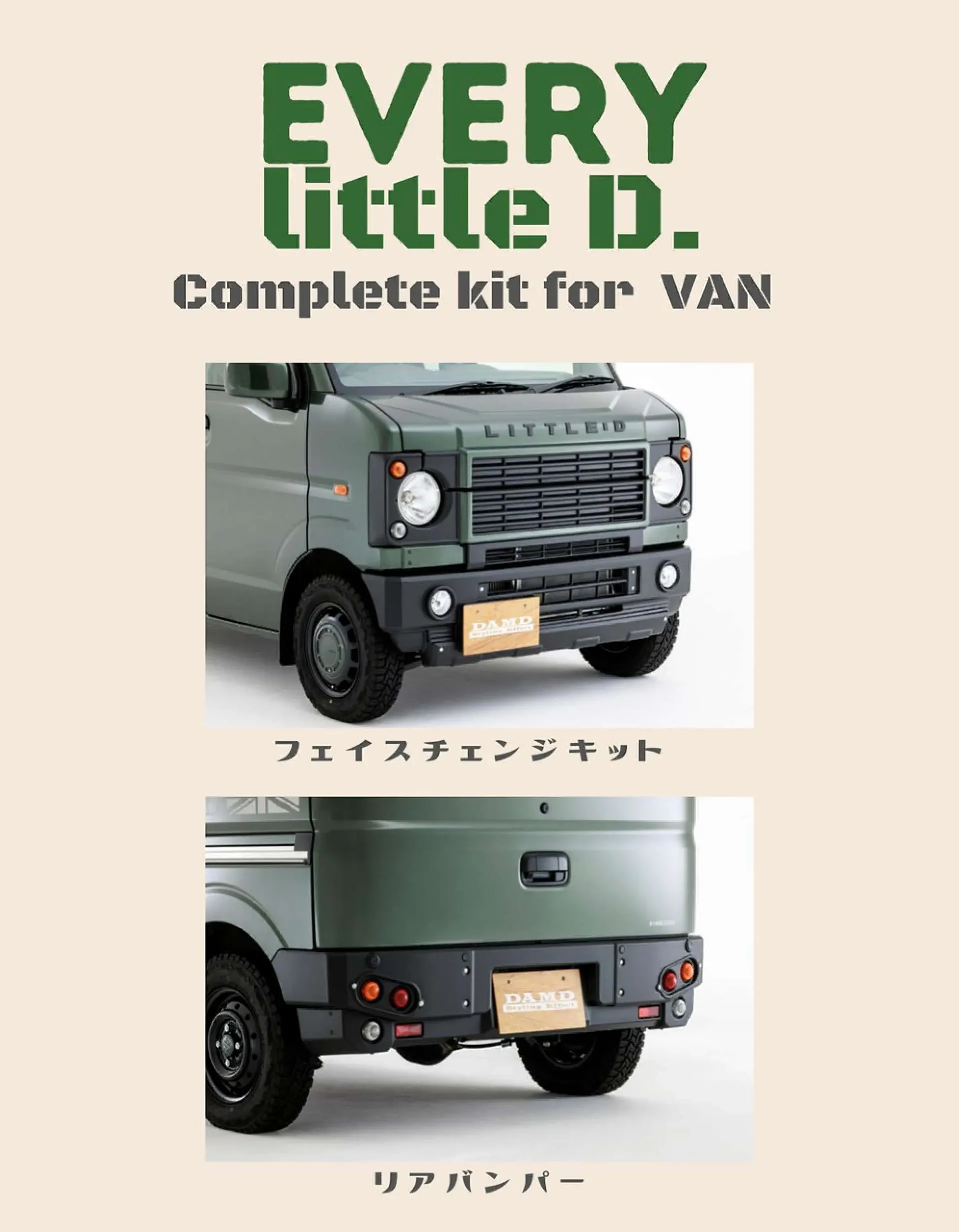 アイコニックなルーバーグリルで、大きく印象を変える丸目フェイスチェンジキットと丸型テールランプが目を引くリアバンパーがセットになったエブリィ (バン) 向けコンプリートキット。