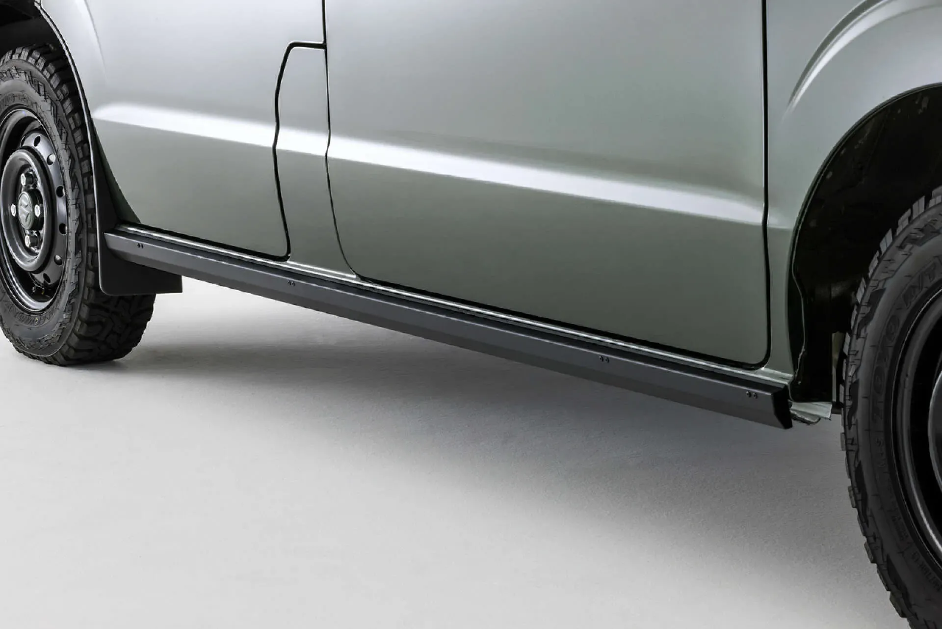 エブリィ ワゴンのサイドスカートを取り外し、メタル感溢れる無骨なサイドビューへ。