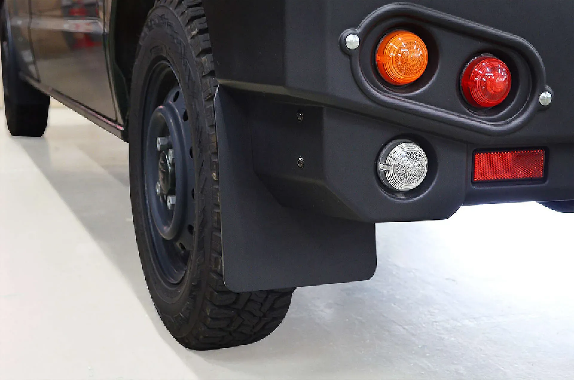 フロントに装着された純正マッドフラップと質感を合わせた、前後のバランスを整えるリアマッドフラップ。